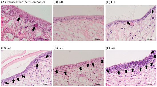 Severity grade of white spot syndrome virus was determined based on the ratio of inclusion bodies (arrow) in the cells of subcuticular epithelium via histopathological analysis.