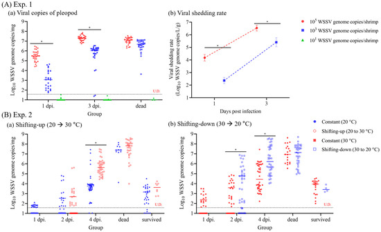 Viral genome copies of the pleopod after intramuscular injection in experiments 1 and 2. (A) In experiment 1, whiteleg shrimp (n = 30/group) were intramuscular injected with 105, 103, or 101 white spot syndrome virus (WSSV) genome copies/shrimp at 25 °C. Viral genome copies of the pleopod collected at different time intervals (1 and 3 d post-infection and after death). (B) In experiment 2, whiteleg shrimp (n = 20/group) were intramuscular injection with 103 WSSV genome copies/shrimp under four different temperature conditions (20 °C: shifting-up; 30 °C: shifting-down) at different time intervals (1, 2, and 4 d post-infection, dead and survived individuals). The horizontal bars indicate the median value of each group. The horizontal dotted line indicates the LOD95% value of this study, and U.D. indicates undetermined. Two-way analysis of variance was performed to determine significant differences in viral genome copies of pleopods between experimental groups at p < 0.05 (*).