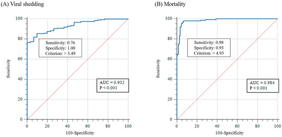 The results of the real-time PCR in Exp. 1 and 2 were used to investigate the threshold of clinical changes (viral shedding and mortality) in WSSV-infected shrimp using the cut-off value, which was determined using ROC curve analysis (Figure 5). The cut-off values for viral shedding and mortality were 3.1 × 103 (103.49) and 8.5 × 104 (104.93) WSSV genome copies/mg, respectively (Figure 5).