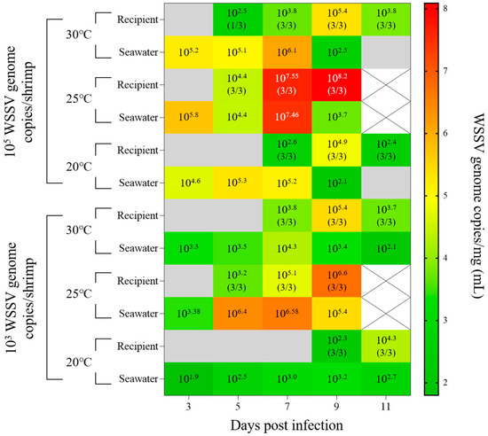 Time-course mean viral copies of pleopods in recipients (n = 3) and viral loads of seawater in experiment 5 (cohabitation challenge). The values in each plot indicate the mean viral copies/mg (the prevalence of each sampled shrimp) and mean viral copies/mL. The gray block indicates values below the LOD95% value, and the white ‘x’ marked box indicates time points at which no measurements were carried out due to all shrimp being dead.