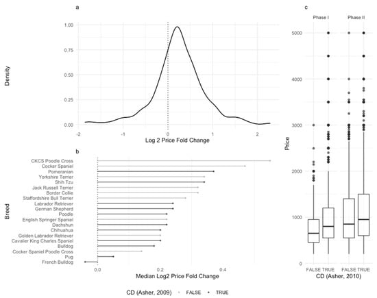 Price increases between phases. A per-breed price fold change was calculated as the Phase 2 price as a proportion of its corresponding Phase 1 value. (a) The distribution of log2 advertised price fold change (x-axis) demonstrated an increase in Phase 2 prices (mean = 0.24, 95% CI = [0.16, 0.31]). (b) Log2 price fold change (x-axis) per breed (y-axis) for the top 20 most popular breeds were uniformly increased in Phase 2, except for French Bulldogs, which decreased. (c) The distribution of advertised price (y-axis) split by Phase and CD status (x-axis, where True is CD and False is non-CD). The increase in price between phases was most pronounced for non-CD breeds (p < 0.001) [,].
