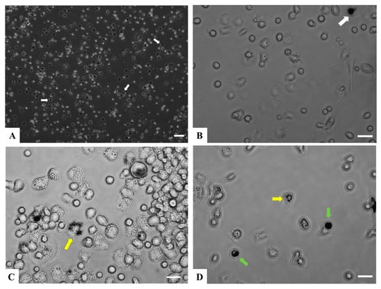 Adherent RT-HKD primary cells under in vitro culture conditions. (A) Phase contrast image at 72 h after removal of nonadherent cells at 100×. The white arrows indicate cells showing morphology of macrophage-like cells. (B) Image of cells at 72 h after removal of nonadherent cells, 400×. The white arrow indicates a cell showing morphology of macrophage-like cells. (C) Phase contrast image of a group of various types of granulocytes at 6 days after removal of nonadherent at 400×. The yellow arrow indicates a multi-lobed (polymorph) nucleus leukocyte. (D) Phase contrast image of a group of small lymphoid-like cells at 6 days after removal of nonadherent at 400×. The yellow arrow indicates a multi-lobed nucleus leukocyte, and the green arrows point to cells with morphology consistent with large mononuclear lymphocytes. Scale bar A = 100 μm; B, C, D = 25 μm. Brightness of image (B–D) was increased post-capture using Adobe Photoshop.