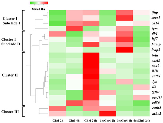 To visualize the expression pattern of differentially expressed genes (DEGs), a heatmap was generated and the color gradient denotes the change in relative abundance (RA). As shown in Figure 2, the hierarchical clustering analysis was conducted by computed Z-scores, which represent the relationship of normalized and scaled RAs of each gene to the mean of a group of genes, revealing the distances between differentially expressed genes (rows) induced by ghrelin treatments. Three major clusters were formed for DEGs relevant to various immune processes. Cluster I was further partitioned into two predominant subclades that had unique patterns of potential physiological significance (Figure 3 and Figure 4). Cluster II consisted of DEGs that established the most divergent responses between two ghrelin isoforms, particularly at 24 h where rt-Ghrl, but not rt-desVRQ-Ghrl, strongly induced expression over baseline (RA = 1) (Figure 5 and Figure 6). Cluster III consisted of early (2 h to 4 h) response genes that showed the most robust induction with ghrelin isoforms (Figure 7). More detailed descriptions of these patterns are presented in subsequent sections.