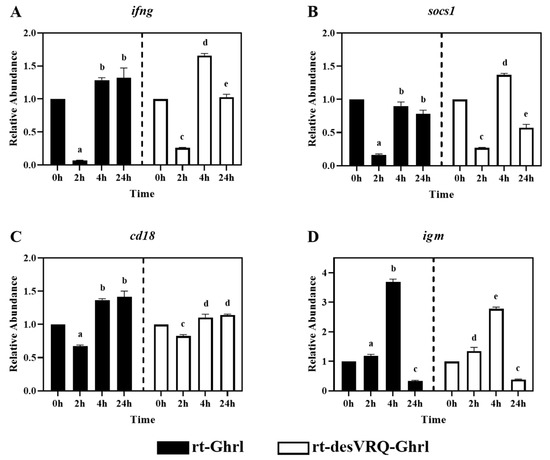 Regulatory effects of ghrelin analogs on relative abundances of genes involved in Cluster I-Subclade I in RT-HKD cells. The differential expression levels of (A) interferon-gamma (ifng), (B) suppressor of cytokine signaling 1 (socs1), (C) cluster of differentiation 18, integrin b2, (cd18), and (D) immunoglobulin M (igm) were measured by real-time qPCR. The relative abundances (RAs) of each gene of interest were quantified in responding to ghrelin analogs treatment or L15 control. The bars presented the RA of each mRNA as means ± SEM (n = 4). The black bars indicate the RA of each mRNA after rt-Ghrl treatment and white bars indicate the RA after rt-desVRQ-Ghrl treatment. Significant differences were analyzed by using two-way ANOVA with time + treatment as main effects. When there was a significant ANOVA effect (p < 0.05), differences between conditions were determined by pair-wise comparisons of the group means with Fisher’s LSD test. Alpha scripts represent significant differences (p < 0.05) among conditions for each specific gene; groups with the same alpha scripts are not significantly (p > 0.05) different from one another.