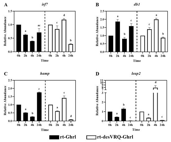 Regulatory effects of ghrelin analogs on relative abundances of genes involved in Cluster I-Subclade II in RT-HKD cells. The differential expression levels of (A) interferon regulatory factor 7 (irf7), (B) beta-defensin (db1), (C) hepcidin antimicrobial peptide (hamp), and (D) liver-expressed antimicrobial peptide 2 (leap2) were measured by real-time qPCR. The RA of each gene of interest was quantified in responding to ghrelin analogs treatment or L15 control. The bars presented the RAs of each mRNA as means ± SEM (n = 4). The black bars indicate the RA of each mRNA after rt-Ghrl treatment and white bars indicate the RA after rt-desVRQ-Ghrl treatment. Significant differences were analyzed by using two-way ANOVA with time + treatment as main effects. When there was a significant ANOVA effect (p < 0.05), differences between conditions were determined by pair-wise comparisons of the group means with Fisher’s LSD test. Alpha scripts represent significant differences (p < 0.05) among conditions for each specific gene; groups with the same alpha scripts are not significantly (p > 0.05) different from one another.