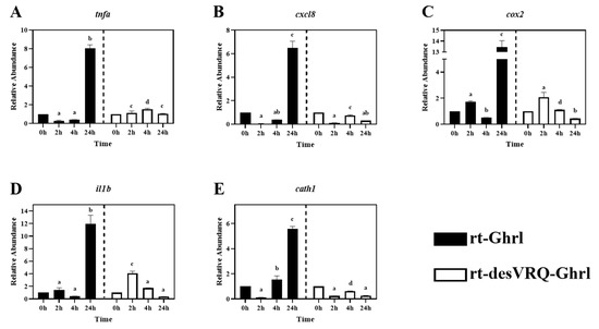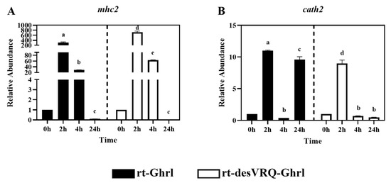 Although cath1 and cath2 showed different patterns, some similarities of late-stage (24 h) inductions were observed in their expression profiles. As shown in Figure 5E and Figure 7B, rt-Ghrl promoted late inductions of both cath1 and cath2 at 24 h, whereas rt-desVRQ-Ghrl inhibited the expressions of both cathelicidin paralogs at this late stage. This finding once again suggests that divergent actions of ghrelin analogs on different assessed genes may lead to differentially expressed cath1 and cath2 at 24 h, but that changes to related gene targets such as these may be subtle and change only the magnitude or timing of the response.