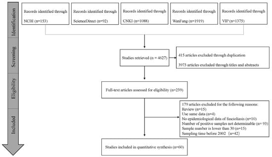 This study was performed according to preferred reporting items for systematic review and meta-analysis (PRISMA) guidelines []. PubMed (https://pubmed.ncbi.nlm.nih.gov/), ScienceDirect (https://www.sciencedirect.com/), Chinese National Knowledge Infrastructure (CNKI; https://www.cnki.net/), Wanfang Data (http://www.wanfangdata.com.cn/index.html), and the VIP Chinese Journal Database (http://www.cqvip.com/) were used to search for publications regarding F. hepatica and F. gigantica in sheep and goats. All databases accessed on 25 August 2022. We retrieved all the published papers on the fasciolosis in sheep in China from the date of the earliest literature publication to 25 August 2022. The terms “Fasciola hepatica”, “Fasciola gigantica”, “fasciolosis”, “Sheep”, “Goat” and “China” were used as the keywords for advanced search, and they were set to be use as synonyms for the purposes of expanding the area of the precise search. All retrieved articles were sent to EndNote X9 and duplicates were removed. The languages were restricted to Chinese and English. Then, we applied the following inclusion criteria: (1) the studies must include prevalence on the presence of fasciolosis in sheep or goat in China; (2) the studies must provide the total number and disease-positive numbers of sheep or goats; (3) the study sample size must be greater than 30; and (4) the study design must be cross-sectional and must provide raw data for epidemiological analysis. Articles were excluded if they were not compatible with these standards. Additionally, we did not contact the original authors to obtain more information, nor did we count unpublished studies.