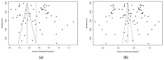 Funnel plot for the examination of publication bias. (a) Funnel plot with pseudo 95% confidence interval limits. (b) Funnel plot with trim and filling analysis.