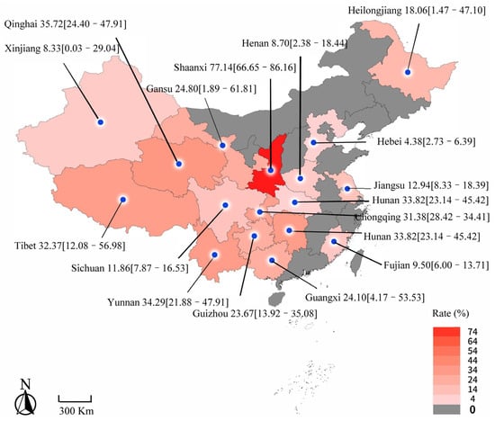 The prevalence of ovine and caprine fasciolosis varied between different regions, and it ranged from 4.38% (21/478) to 31.89% (17,531/77,149) (see Table 1). The Shaanxi Province subgroup possessed the highest prevalence (77.14%, 54/70), while Hubei had the lowest prevalence (3.95%, 266/6727) (Figure 4 and Table 1). In the subgroup analysis of altitude, the prevalence of ovine and caprine fasciolosis was 28.23% (5699/42,306) at high altitudes and 23.75% (38/160) at low altitudes. The subgroup analysis based on rainfall showed that ≥800 mm (19.85%, 1791/10,009) demonstrated a higher disease prevalence than <800 mm (15.34%, 24,337/236,786). The temperature of 10–20 °C had a higher disease prevalence (19.85%, 1791/10,009) than 10 °C (13.75%, 5146/41,342). No significant difference existed in subgroups mentioned above. In terms of seasons, the infection rate was highest in spring (36.28%, 5544/75,550), followed by autumn (15.13%, 2550/36,747), summer (11.45%, 552/3183) and winter (5.44%, 6828/74,021). The statistical analysis showed that winter was associated with a lower risk of ovine and caprine fasciolosis (p < 0.05). The results mentioned above are shown in Table 1.
