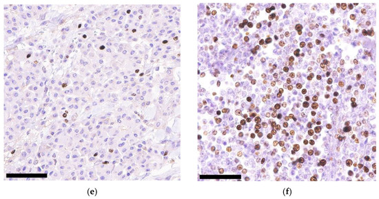The Ki67 count was determined in 65 cases; in 3 cases, it was not possible to obtain any evaluable staining, despite repeating the process several times. The average count of Ki67-positive cells from five fields of 250 × 250 µm each ranged from 1.4 to 77.2 (median: 24.0). In this study, 34/65 tumours (52.3%) were above the threshold (more than 23 Ki67-positive cells per grid area), of which 6 (17.6%) were Patnaik grade I. Some 23 tumours (67.7%) were grade II (22 Kiupel low-grade, 1 Kiupel high-grade), and the remaining 5 (14.7) were grade III. Two examples of Ki67 staining are shown in Figure 1e,f.