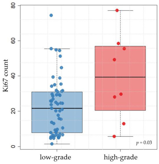 Distribution of Ki67-positive cells (average of five fields, each 250 × 250 µm) on the y-axis, within the Kiupel two-tier system on the x-axis. The association between the two parameters was statistically significant (p = 0.03).