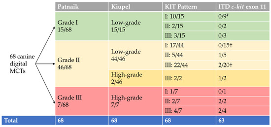 The aim of this study was to examine canine digital MCTs histologically (with Patnaik and Kiupel grading) and immunohistochemically (with KIT pattern and Ki67 count) on a larger scale, and to provide an overview of c-kit mutation status.