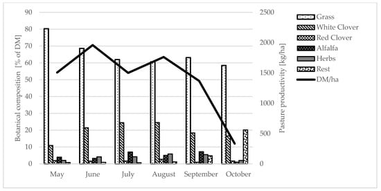 The way in which the animals were fed depended on the season. During the winter, it was based on ad libitum hay with the addition of concentrated feed and vitamin and mineral supplements. Hay distributed on the feed table was not crushed or mixed with other feeds. During the grazing season, whenever possible, the animals went out to pasture to take in pasture fodder. The cows were grazed on pastures in a rotational system with technological grouping, taking into account the stage of lactation. The pasture stocking rate was about 10 cows per hectare. The botanical composition of the pastures and their productivity is shown in Figure 1. The pastures were distributed on slightly undulating terrain with hills whose relative heights did not exceed 5 m. The time spent on the pasture depended on weather conditions (temperature and rainfall). When conditions were favorable, the animals spent approximately 20 h a day on pasture, going down to the barn only for milking. After milking, they received a concentrated feed supplement, the amount of which depended on the cows’ stage of lactation (from 6 to 8 kg at the beginning of lactation, 3 to 4 kg during the middle phase of lactation, and 1 kg at the end of lactation—feed concentrate per cow per day). The concentrated feed ration consisted of oats, lupine, and barley, and mineral additives in the form of sea salt, fodder chalk, and mixed vitamins and minerals. The feed concentrate was divided into two portions: one given after the evening milking and the other after the morning milking. In cases where the weather conditions were unfavorable, the animals were fed with cut, green fodder (which had not been crushed or mixed with other feed) delivered to the feed table in the barn.