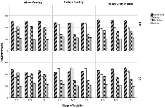 The time spent by cows on individual activities can vary depending on the factors involved, for example, milking time, frequency and time of feeding [31], and the type of feed and its fineness [32,33]. In the present study, the cows’ time budgets were analyzed in relation to their diet (summer feeding—pasture, summer feeding—fresh grass in the barn, winter feeding—hay), lactation group (FS, MS, LS), and breed (HF, BS).