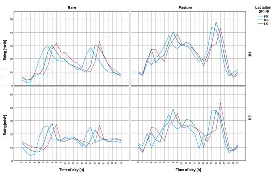 Changes in feed intake intensity on a daily basis for Holstein-Friesian and Brown Swiss cows on pasture and in the barn. FS—first stage of lactation, MS—middle stage of lactation, LS—last stage of lactation, HF—Holstein-Friesian, BS—Brown Swiss. Morning milking started around 5:00 a.m. and afternoon milking started at 4:00 p.m. Cows were admitted to the hall according to their associated lactation group, starting with the group of cows in the first stage of lactation.