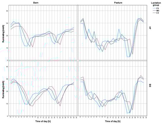 Changes in ruminating intensity on a daily basis for Holstein-Friesian and Brown Swiss cows on pasture and in the barn. FS—first stage of lactation, MS—middle stage of lactation, LS—last stage of lactation, HF—Holstein-Friesian, BS—Brown Swiss. Morning milking started around 5:00 a.m. and afternoon milking started at 4:00 p.m. Cows were admitted to the hall according to their associated lactation group, starting with the group of cows in the first stage of lactation.