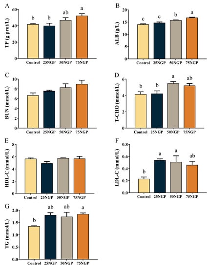 Figure 1 showed that, compared to the Control group, the TP, ALB, and BUN levels of the 25NGP group had no significant difference, whereas the TP and ALB levels of the 50NGP and 75NGP groups were significantly higher (p ˂ 0.05). In addition, the TP level of the 25NGP group was significantly lower than the 75NGP group, and the ALB level of the 25NGP group was significantly lower than the 50NGP and 75NGP groups (p ˂ 0.05).