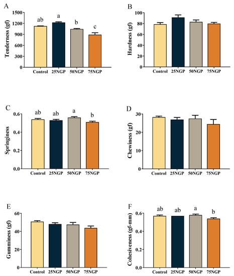 The muscle textural properties of the juvenile golden pompano are shown in Figure 2. The muscle hardness, chewiness, and gumminess in each group showed no significant difference. Compared to the Control group, the tenderness, springiness, and cohesiveness of the 25NGP group were not significantly different, whereas the tenderness of the 75NGP group was significantly decreased. Furthermore, the tenderness of the 25NGP group was significantly higher than that of the 50NGP and 75NGP groups (p < 0.05). The above results indicate that the substitution of 25% FM with NGCP had no negative impact on the muscle textural properties of golden pompano.