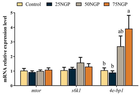 Figure 3 shows that, compared to the Control group, the mRNA expression of 4e-bp1 in the 25NGP and 50NGP groups had no significant difference, but the 75NGP group was significantly up-regulated (p < 0.05). Moreover, the mRNA expression of mtor and s6k1 in each group had no significant differences. The above results indicate that the substitution of 50% FM with NGCP did not negatively affect the protein metabolism of golden pompano.