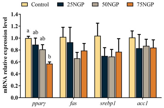 Figure 4 showed that, compared to the Control group, the mRNA expression of pparγ in the 25NGP–50NGP groups had no significant difference, but the 75NGP group was significantly down-regulated (p < 0.05). Moreover, there was no significant difference in the mRNA expression of fas, srebp1, and acc1 among all groups. The above results indicate that the substitution of 50% FM with NGCP had no negative effects on the lipid metabolism of juvenile golden pompano.