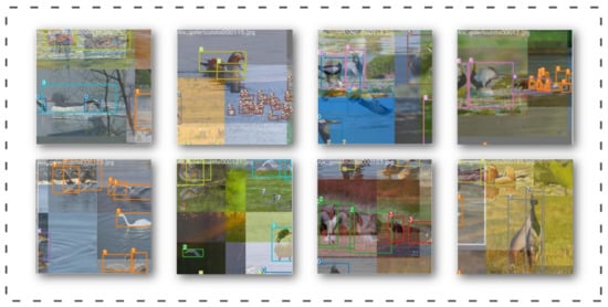 Mosaic data augmentation. First, from the dataset of birds, a batch of image data was randomly extracted. Then, four images were randomly selected, randomly scaled, randomly distributed, and spliced into new images, and the above operations were repeated for batch size times. Finally, the neural network was trained using the Mosaic data augmentation data.