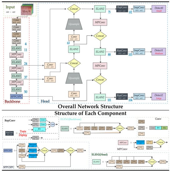Finally, YOLOv7 came out in 2022 with the network architecture shown in Figure 5. Based on its predecessor, it innovatively proposes the extended ELAN architecture, which can improve the self-learning capability of the network without destroying the original gradient path. In addition, it employs a cascade-based model scaling method so that a model of the appropriate scale can be generated for the actual task to meet the detection requirements. The introduction of these new tricks and architectures further improves the performance and effectiveness of the YOLO series networks. In this paper, we take the YOLOv7 network as a baseline and further enhance it.
