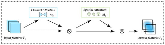 In the process of exploring the application of attention mechanisms in computer vision, many excellent works have emerged, although they also have some drawbacks. For example, SENet [44] also brings the problem of low efficiency when suppressing unimportant pixels, CBAM [45] performs channel and spatial attention operations sequentially, while BAM [46] does them in parallel, but they both ignore the channel–space interaction, thus losing the cross-dimensional information. Considering the importance of cross-dimensional interactions, TAM [47] improves efficiency by exploiting the attention weights between each pair of 3D channels, spatial width and spatial height. However, the attention operation is still applied to two dimensions at a time, instead of all three dimensions. Therefore, to amplify cross-dimensional interactions, GAM [48] proposes an attention mechanism capable of capturing important features in all three dimensions, which is able to amplify global dimensional interaction features even with reduced information dispersion. The authors use a sequential channel–space attention mechanism and redesign the CBAM submodule. The whole process is shown in Figure 6, and the definitions are stated in Equations (3) and (4). Given an input feature map , the intermediate state and the output are defined as follows: and are the channel attention map and the spatial attention map, respectively, and denotes the multiplication operation by the elements.