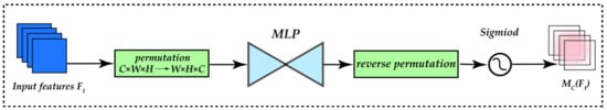 The channel attention submodule uses a three-dimensional arrangement to retain information in three dimensions. Then, it uses a two-layer MLP (Multilayer Perceptron) to amplify the cross-dimensional channel–space dependence. (MLP is an encoder–decoder structure, the same as BAM, and its compression ratio is ); the channel attention submodule is shown in Figure 7.