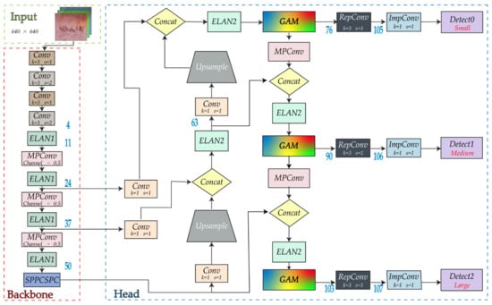 In order to increase the precision of object detection, GAM is added to the YOLOv7 network in this study. The modified network structure is shown in Figure 8. There are two primary uses for the GAM module. First, it can lessen information dispersion, allowing the network to focus more on the properties of the target object and enhance detection performance. Second, it can expand the global interactive representation, increase the sufficiency of information exchange between various components, and improve the accuracy of detection. When attention mechanisms are added to the backbone network, some of the original weights of the backbone network are destroyed, which causes errors in the prediction results of the network. In this case, we decided to keep the original network features intact while incorporating the attention mechanism into the enhanced feature network extraction.