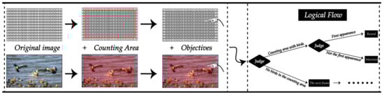 For the logical implementation of the counting area, this paper first makes a matrix of the same size as the image and fills it with 1 to form the counting area. Next, we replace the value of the area we’re counting with a 0 and reassign the detected bird’s position information passed back to the corresponding position on our matrix to 1 to mark the presence of the bird in that area. Finally, we judge whether to count according to whether there is a 1 in the counting area. The counting method realized by this logic can effectively record the number of birds. The overall logical implementation diagram of the counting method is shown in Figure 11, which clearly shows the counting process of the method.