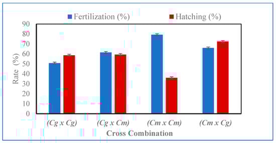 The results of the fertilization and hatching rates of C. gariepinus, C. macromystax, and their hybrids are presented in Figure 1.