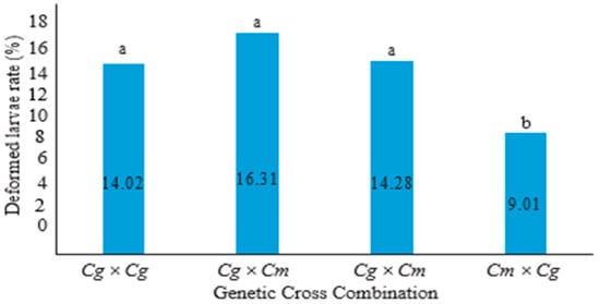 The hatching rate of reciprocal hybrids C. macromystax × C. gariepinus (Cm × Cg) was (p > 0.05) significantly higher (72.40%) in all crossing combinations, while the lowest hatching rate was obtained in the pure progeny of C. macromystax × C. macromystax (Cm × Cm). Female C. gariepinus × male C. gariepinus had the highest rate of hatchability (88.0%), while the lowest hatching rate was obtained in the cross between female C. macromystax × male C. gariepinus (77.0%). However, there were no significant differences in the hatching rates between the pure progeny of C. gariepinus (Cg × Cg) and the C. gariepinus × C. macromystax (Cg × Cm) hybrid. The rate of larvae that are deformed in C. macromystax and C. gariepinus is illustrated in Figure 2, which reveals that it varied from one cross combination to another in all the crossing combinations. The deformed larvae rate was significantly (p < 0.05) lower in the reciprocal hybrid of C. macromystax × C. gariepinus (Cm × Cg). There were no significant differences in the deformed larvae between the hybrid cross of C. gariepinus × C. macromystax (Cg × Cm) and the two pure progeny of C. gariepinus and C. macromystax.