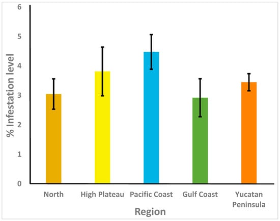 Varroa destructor infestation rates (% ± SE) in adult honey bees from colonies of Mexico’s five beekeeping regions. n = 369.