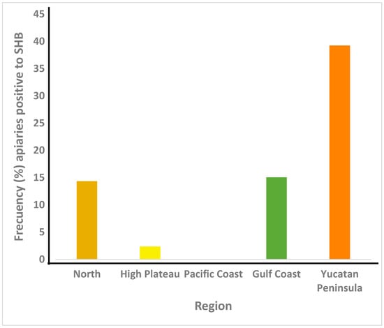 The results are shown in Figure 3. Aethina tumida’s prevalence was 25.2% nationwide with significant differences between regions (p < 0.05). The highest frequency of SHB occurred in the Yucatan Peninsula (39.2%), and it was not found in the Pacific Coast region. Where SHB was detected, the lowest prevalence was for the High Plateau region (2.3%).