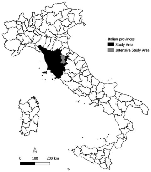 The study was conducted in Tuscany (lat. 43°25′ N, long. 11°00′ E), a region covering about 22,700 km2 (excluding islands) located in north-central Italy and placed between the Northern Apennines and the Tyrrhenian Sea (elevations ranging between 0 and about 2050 m a.s.l.) (Figure 1). Most of the territory is hilly (66.5%) or mountainous (25.1%). Forested and bushy areas cover about 11,636 km2, corresponding to 50.6%, of the region (Land Use, 2013 [53]) and consist mostly of deciduous woods: manly oak (Quercus cerris and Quercus pubescens), chestnut (Castanea sativa), and beech (Fagus sylvatica) in the hilly and mountainous parts of the region and holm oak (Quercus ilex) in the littoral area. Conifer woods represent about 15% of the forested areas. About 8765 km2 (38.6%) of the region is covered by agricultural areas, mainly grain crops (2000 km2), olive groves (920 km2), and vineyards (600 km2).