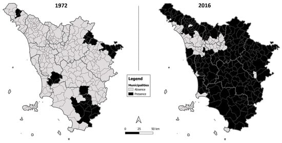 Wolf distribution in the Tuscan municipalities in 1972 (from Cagnolaro et al. [87]) and 2016 (present study).
