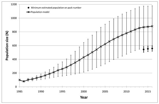 In our study, the average minimum population size empirically estimated from 2014 to 2016 corresponded to 66.2% of the number estimated by the population viability model, which predicted around 882 wolves in Tuscany in 2016 with good precision (SE = 9.40) and a standard deviation (297.17) of the same magnitude of the variability in parameters’ estimates. This result was consistent with other long-term monitoring efforts, such as those in some North American states (e.g., Montana, Idaho, and Wisconsin) where wolves have experienced a recovery pattern as in Italy. In these states, monitoring procedures combined the minimum wolf population based on pack recordings with other statistical approaches [91]. This was the case in Montana [92] and Wisconsin [63], where the verified minimum number of residing wolves was followed and combined with a patch occupancy model to estimate the actual number of wolves. Similarly, we consider our empirical estimates, falling within the lower limits of the model’s confidence intervals, an underestimation of the true population size. Our model results, in turn, can be evaluated as an underestimation of the real biotic potential of the population, since considering a close population, as conducted in the present study, excluded the contribution from neighboring populations that can be a major component of population increase [7]. Population size can be better estimated by combining monitoring approach, which can obtain a precise knowledge of demographic parameters from an adequate number of resident packs, with the modeling approach, thus providing a more realistic estimation of the population size.