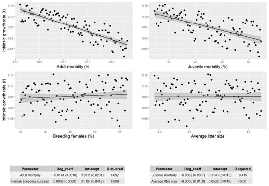 Sensitivity analyses showed that both adult and juvenile mortality played significant roles in the variance of growth rates (Table 3). The percentage of breeding females, which varied between 34.9% and 56.5%, and average litter size, which varied between 2.9 and 4.7 pups, did not show an effect on population trends (regression coefficient B in the single parameter model < 0.001), while the 1% increase of adult mortality caused a decrease of about 0.014 in the intrinsic growth rate (Figure 4).