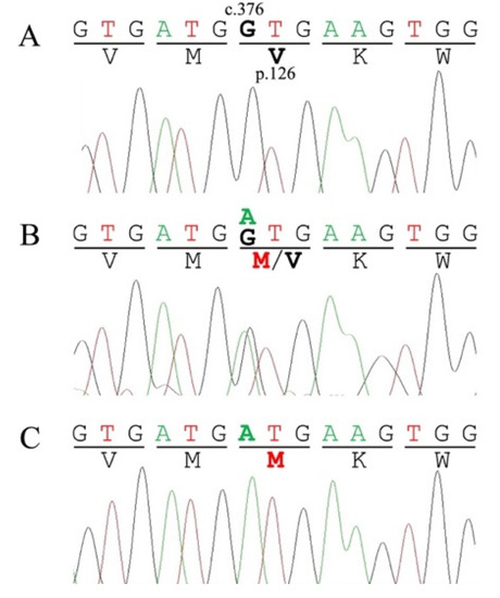 Partial genomic sequence electropherograms of exon 4 in the feline NPC2 gene from a clinically healthy control cat (A), a Japanese domestic cat (B) with Niemann–Pick disease type C (NPC), and a Siamese cat with NPC (C). The control cat is a homozygous wild-type (c.376G/G). The Japanese domestic and Siamese cats are heterozygous (c.376G/A) and homozygous (c.376A/A) for the c.376G>A (p.V126M) mutation, respectively.