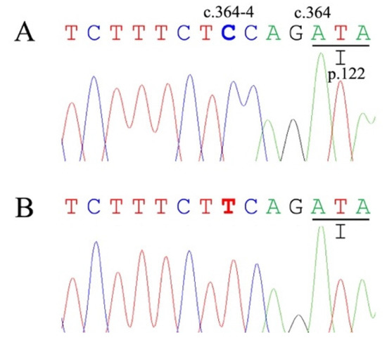 Partial genomic sequence electropherograms of the 5′-end of exon 4 in the feline NPC2 gene from a clinically healthy control cat (A) and a Japanese domestic cat (B) with Niemann–Pick disease type C (NPC). The control cat is a homozygous wild-type (c.364-4C/C). The Japanese domestic cat is homozygous (c.364-4T/T) for the c.364-4C>T variant.