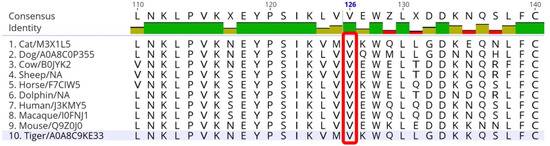In association with the feline NPC2:c.376G>A (p.V126M) mutation, the preserving property of an amino acid residue of p.V126 was surveyed in a variety of animals using Protein BLAST (Figure 3). As a result, valine at position 126 was found to be highly preserved in many mammals including dogs, cattle, sheep, horses, dolphins, humans, macaques, mice, and tigers.
