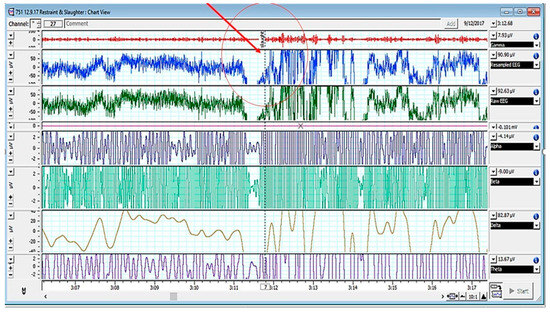 EEG spectrum of cattle pre- and post-slaughter (Note: encircled/red arrow showing the point of slaughter). Adopted from [3].