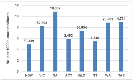 Numbers of cat admissions to municipal councils, welfare organizations and animal rescue groups per 1000 human residents and total number by state/territory in 2018–2019. Abbreviations: NSW (New South Wales); VIC (Victoria); SA (South Australia); ACT (Australian Capital Territory); QLD (Queensland); NT (Northern Territory); WA (Western Australia); TAS (Tasmania).