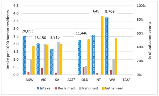 Intakes for municipal councils that operated pounds (numbers above bars), intakes per 1000 human residents (left-hand axis) and percentages of outcome events where the cat was reclaimed, rehomed, and euthanized (right-hand axis) in 2018–2019 by state/territory. 1 The state government in ACT and the municipal councils in TAS did not operate a pound for cats.