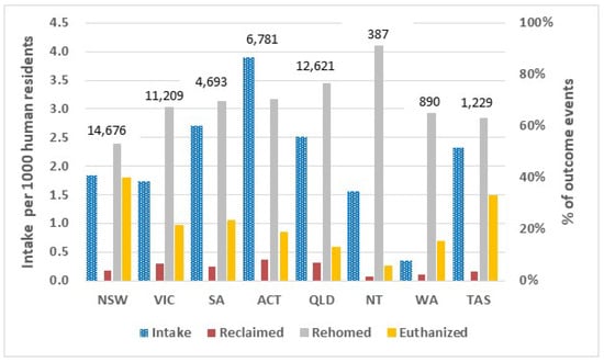 Tasmania had the highest numbers rehomed per capita (7.3/1000 residents or 84% of all outcomes) and New South Wales had the lowest (2.7/1000 residents; 49% of outcomes) (Figure 3; Table 2).