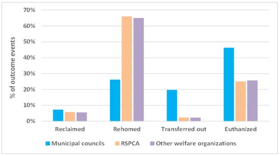 Our hypotheses were, firstly, that improvements in the proportion of cats returned to owners, rehomed, or euthanized have occurred since previous peer-reviewed state-based [] or organizational reports [,,]; secondly, that live outcomes were higher for animal welfare organizations than municipal councils operating their own pound; thirdly, that urban councils would have lower per capita intakes and better live outcomes than non-urban councils; and, fourthly, that there are a number of life-saving programs yet to be embraced in Australia for various reasons, including legislative barriers.