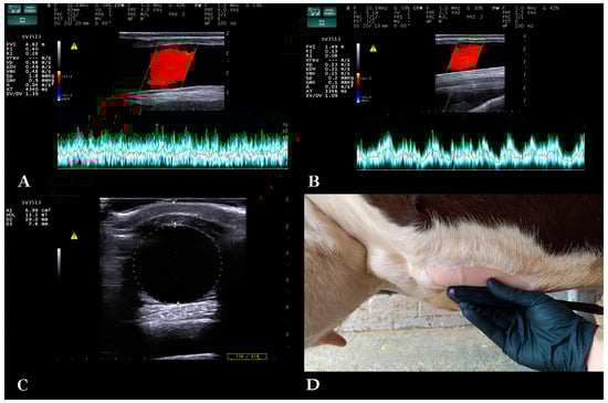 Spectral Doppler examination of the blood flow in the milk vein. (A) Measurement of the blood flow features of a dairy cow’s milk vein on the 14th day in lactation, (B) measurement of the blood flow features of a dairy cow’s milk vein on the 35th day in the dry period, (C) measurement of the distance from skin surface, diameter and cross-sectional area of the milk vein, (D) placement of the probe for Doppler measurement of blood flow.