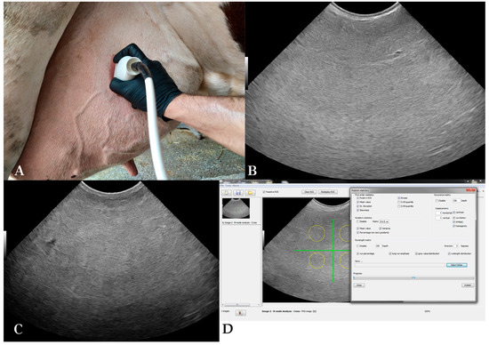 B-mode udder ultrasonography and echotexture analysis: (A) Ultrasonographic examination of the mammary parenchyma, (B) B-mode sonogram of a cow’s right rear quarter on the 75th day in lactation, (C) B-mode sonogram of a cow’s right rear quarter on the 7th day in the dry period, (D) echotexture analysis of a B-mode sonogram of the udder (EchoVet v.2.0).