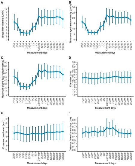 Changes in blood flow (A–C) and morphological (D–F) parameters of the milk vein during the study period: starting from 7 days before the dry period (“DP”), throughout the DP, 7 and 3 days prior to calving, at calving (“C”) and from the 3rd to the 90th day in the new lactation period (“DIM”: days in milk).