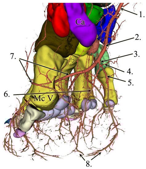 - Baksa, G.; Czeibert, K.; Sharp, V.; Handschuh, S.; Gyebnar, J.; Barany, L.; Benis, S.; Nyiri, G.; Mandl, P.; Petnehazy, O.; et al. Vascular supply of the metacarpophalangeal joint. Front. Med. 2022, 20, 1015895. [Google Scholar] [CrossRef]